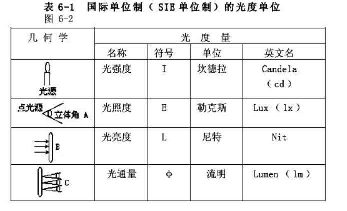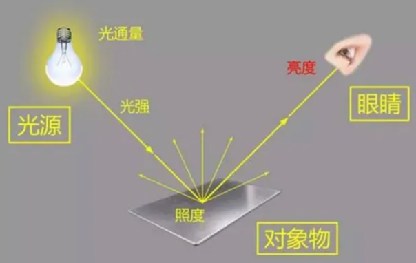 一用于较高发光值者如光源或灯具,直接以其发光强度来表示;另一则用于本身不发光只反射光线者如室内表面或一般物体,则以亮度(nits)表示。总体来说,光通量(流明)是指光源所有方向上发射出光的能力,发光强度(坎德拉)是特定方向上的发光能力,亮度(尼特)是单位面积的发出或反射的发光强度,照度(勒克斯)是单位面积所入射的光量。