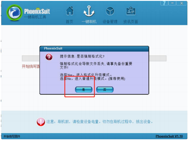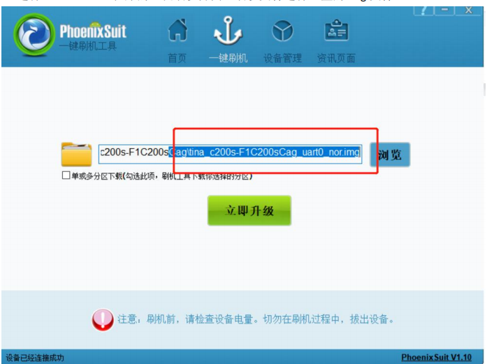 3. 在 PhoenixSuit 应用界面,点击顶部“一键刷机”按钮,切换到“一键刷机界面”再选择好对应的烧录文件。