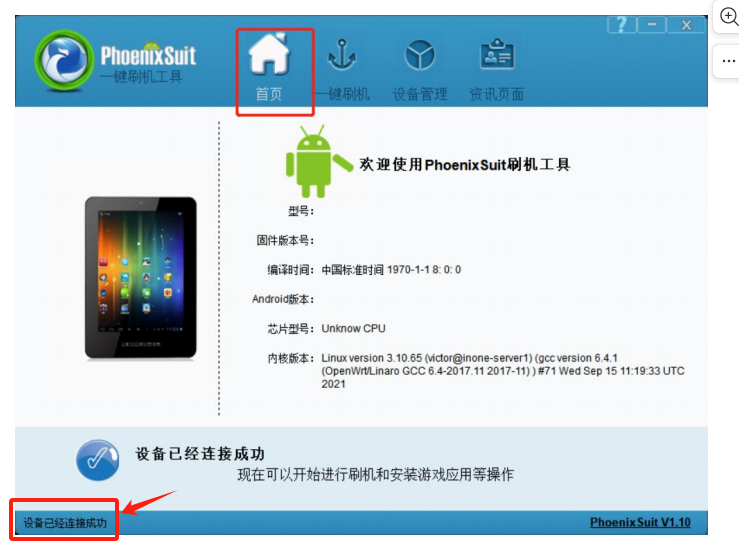 2. 在 PC 端 PhoenixSuit 应用,等板子启动完成,确保看到如下图左下角有“设备已连接成功”字样。