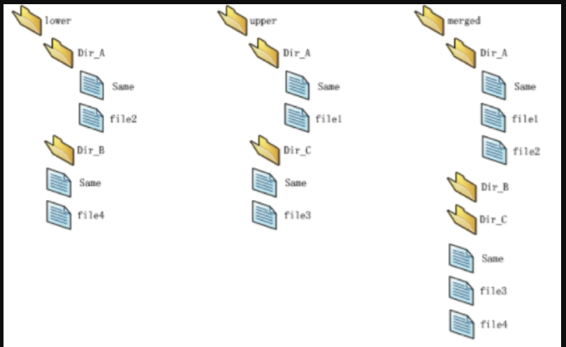 - 目录名相同, 对目录进行合并成一个目录。如上图在 lower 及 upper 目录下都有 dir_A 目录,将目录及目录下的所有文件合并到 merged 的 dir_A 目录,目录内如有文件名相同,则同样只显示 upper 的,如上图中 dir_A 目录下的 same.txt 文件。