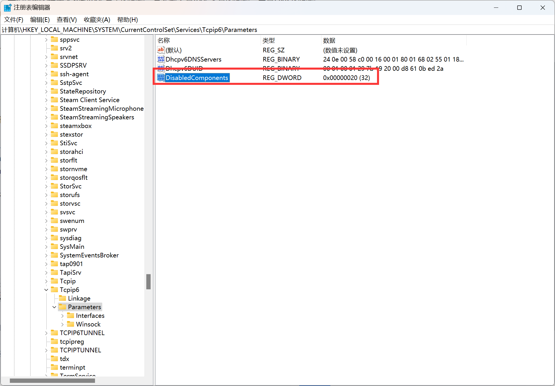 - 有序列表找到 HKEY_LOCAL_MACHINE\SYSTEM\CurrentControlSet\Services\Tcpip6\Parameters 。然后看看右边有没有一个叫 DisabledComponents 的值,没有的话就新建一个 DWORD 值,填这个名字。