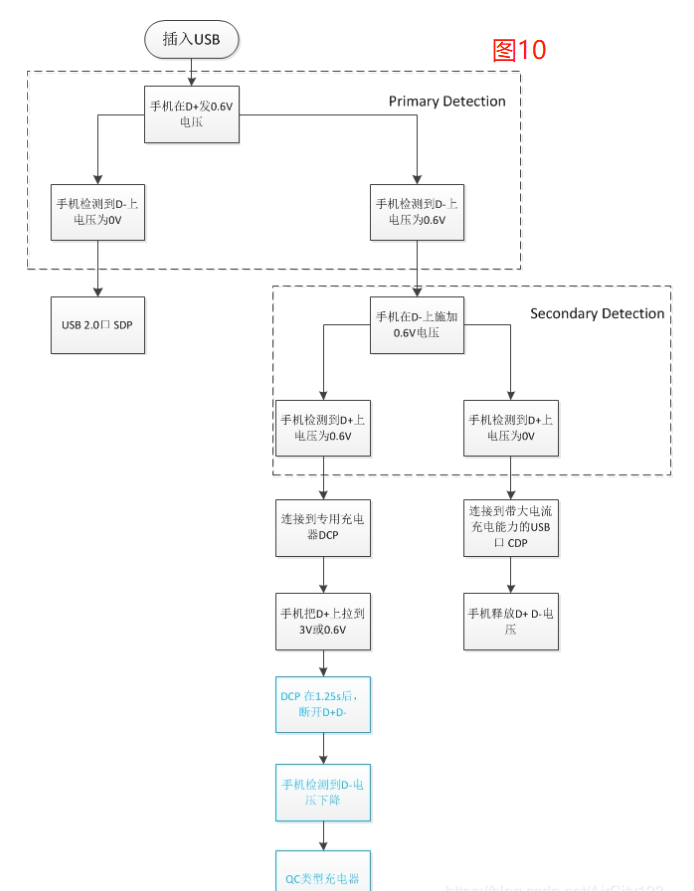 (b) 手机在 D+ 上施加电压 VDP_SRC(一般 0.7V),之后手机检测 D-上的电压,发现 D-电压大于 VDAT_REF(0.4V),此时手机认为自己连接到了一个 CDP 或者 DCP。这个过程叫 Primary Detection。