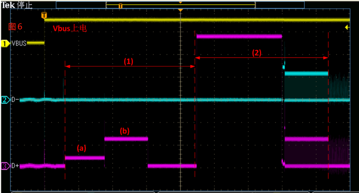 下图 7 是手机插入电脑 CDP 的波形,阶段(1)识别充电器,阶段(2)是 USB 枚举。如同第 2 章,本章节只分析阶段(1)。