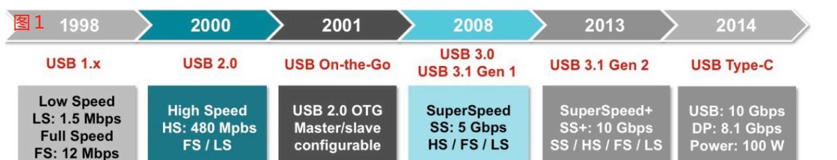 USB3.0——2008.11 发布,增加了超高速模式,USB 从半双工变成了全双工总线,速率高达 5Gbit/s。