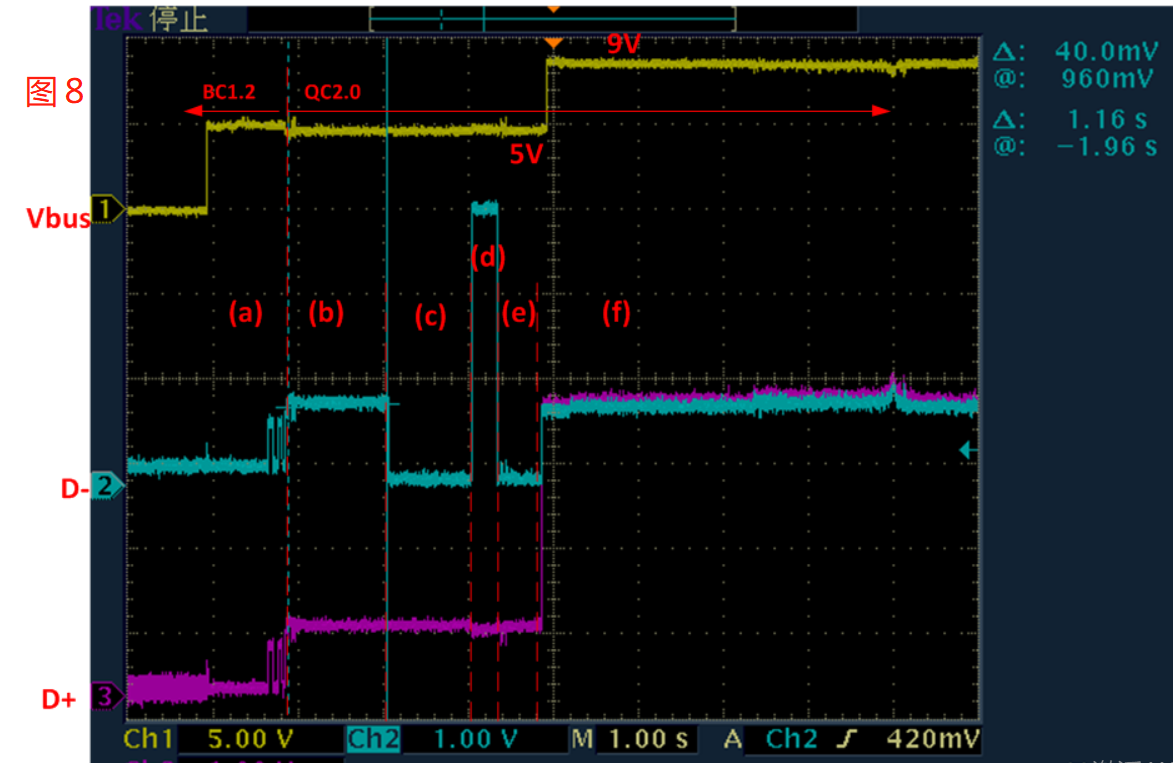 (a)属于 BC1.2 协议规定的识别过程,由于 QC2.0 充电器内部在 USB 插入后,D+ 和 D-通过一个开关短路。我们能看到 Primary Detection 和 Secondary Detection 过程,D+ 和 D-都有 0.7V 脉冲。这时手机认为自己连接到了 DCP。