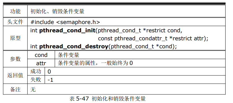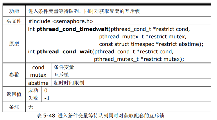等待条件有两种方式:无条件等待 pthread_cond_wait()和计时等待 pthread_cond_timedwait(),其中计时等待方式如果在给定时刻前条件没有满足,则返回 ETIMEOUT,结束等待,其中 abstime 以与 time()系统调用相同意义的绝对时间形式出现,0 表示格林尼治时间 1970 年 1 月 1 日 0 时 0 分 0 秒。