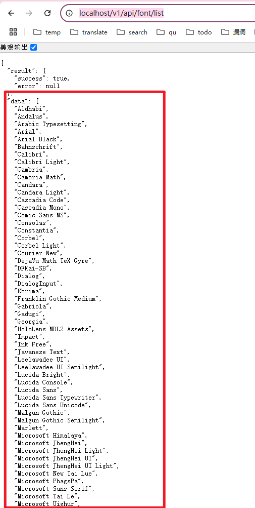 在服务器运行的情况下, 在浏览器上输入 http://localhost/v1/api/font/list, 就能看见字体列表。