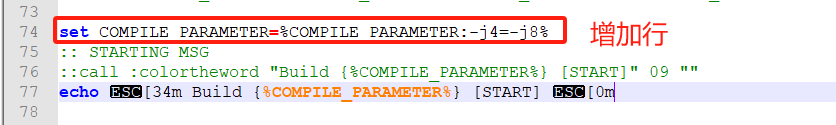 - 在其前面增加“set COMPILE_PARAMETER=%COMPILE_PARAMETER:-j4=-j8%”行,其中-j8 为并行编译 8 线程,根据编译电脑配置实际修改为-jX(X 为实际 PC 线程数);